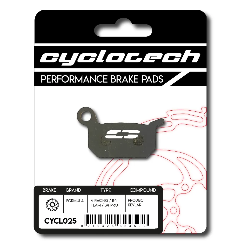 Egal ob Sie in der Stadt, auf dem Trail oder auf einer Tour unterwegs sind, die Cyclotech Prodisc Kevlar Bremsbeläge sind der perfekte Partner für Ihr Formula 4Racing - B4 Bremssystem und bieten:
