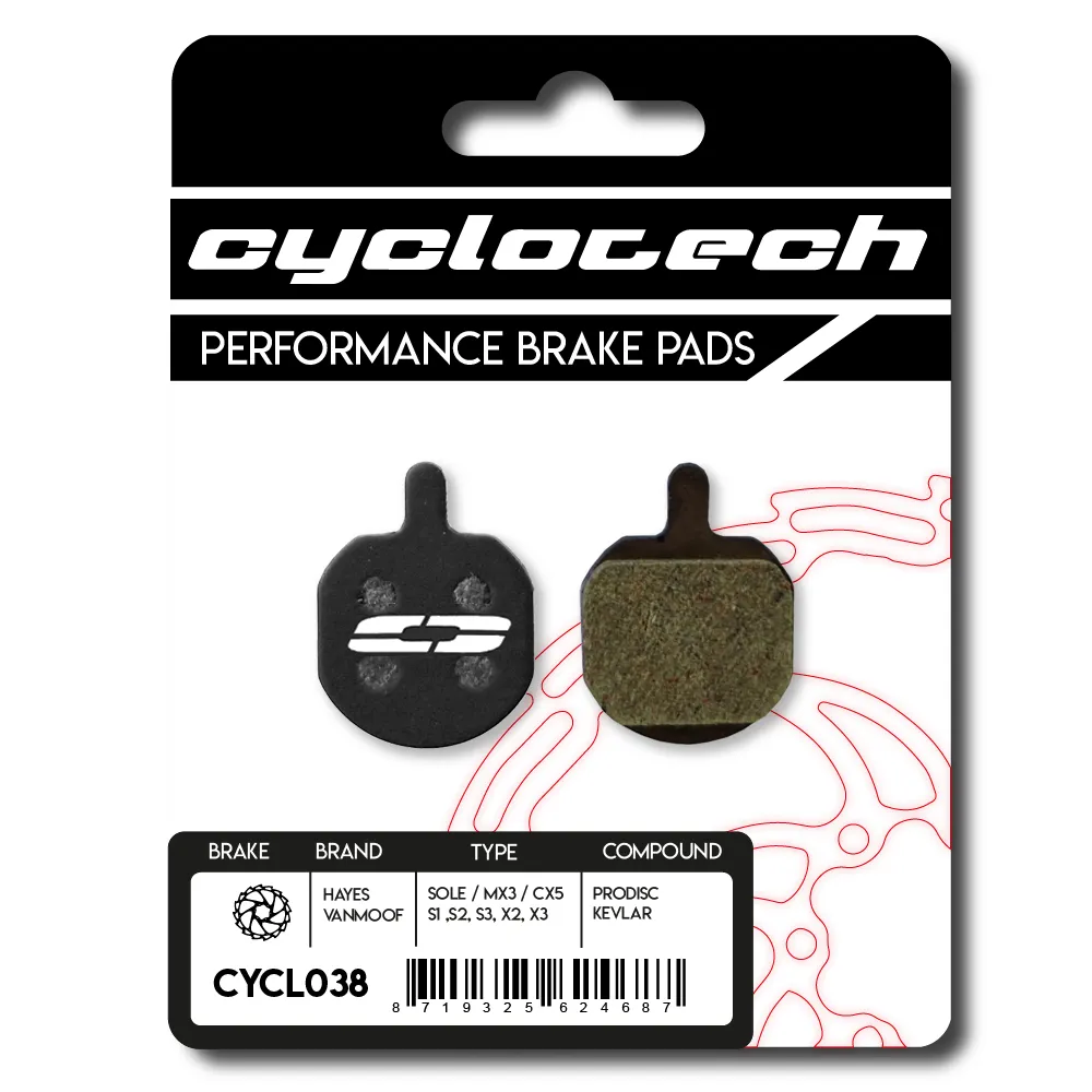 Egal ob Sie in der Stadt, auf dem Trail oder auf einer Tour unterwegs sind, die Cyclotech Prodisc Kevlar Bremsbeläge sind der perfekte Partner für Ihr Hayes Sole - MX3 - CX5 Bremssystem und bieten: