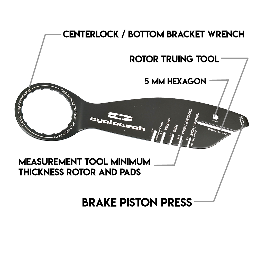 Mit diesem multifunktionalen Scheibenbremswerkzeug schieben Sie einfach die Kolben zurück in die Scheibenbremse, sodass der Einbau Ihrer neuen Bremsbeläge zum Kinderspiel wird. Außerdem messen Sie die Mindestdicke von Bremsscheiben und Belägen und lösen und ziehen den Sicherungsring Ihrer Centerlock-Scheibe fest. Darüber hinaus verfügt das Werkzeug über einen Bremsscheiben-richtwerkzeug und einen 5 mm Sechskant-Ringschlüssel.