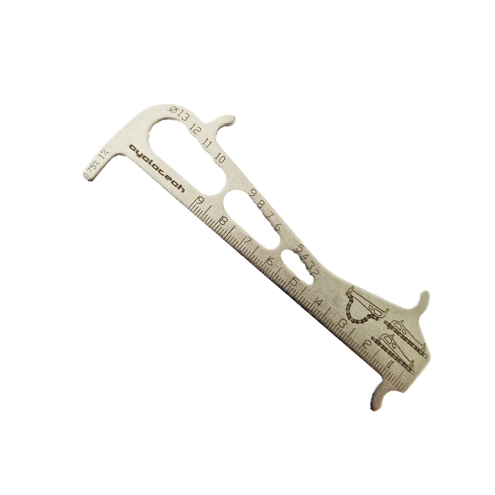Messen Sie mit diesem Kettenverschleißmessgerät schnell und einfach, ob Ihre Kette ausgetauscht werden muss. Zwei verschiedene Seiten zeigen den Verschleiß an (0,75 % und 1 %), damit Sie schnell wissen, wie es Ihrer Kette geht.